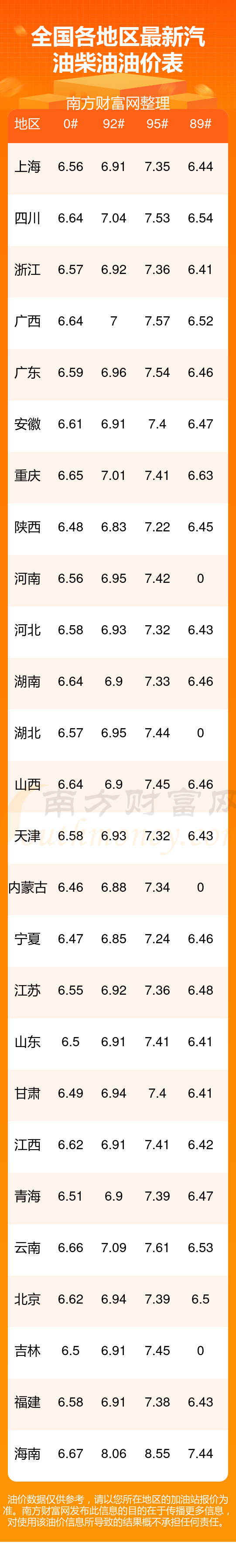 以上油價(jià)信息是當(dāng)前市場上最新油價(jià)信息,油價(jià)數(shù)據(jù)僅供參考,實(shí)際在售油價(jià)可能有小幅偏差,請(qǐng)以您所在地區(qū)的加油站實(shí)際售價(jià)為準(zhǔn)。