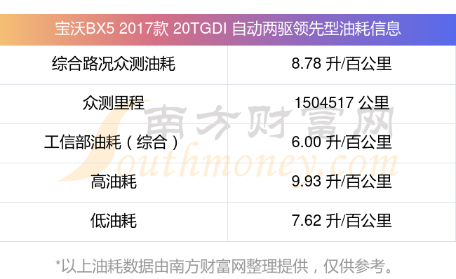 根據(jù)車主實測數(shù)據(jù),該車型低油耗為7.62升每百公里,高油耗為9.93升每百公里,綜合路況眾測油耗為8.78升每百公里,工信部綜合油耗為6.00升每百公里。