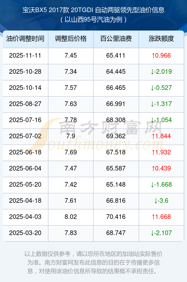 按照11月11日95號汽油最新調(diào)整價格7.45元/升來計算(以山西為例),該車型百公里平均油費為65.411元,按照上一輪10月28日調(diào)整價格7.34元/升來計算,百公里平均油費為64.445元,對比上一輪多花0.966元,下一輪油價調(diào)整時間為11月24日24時。