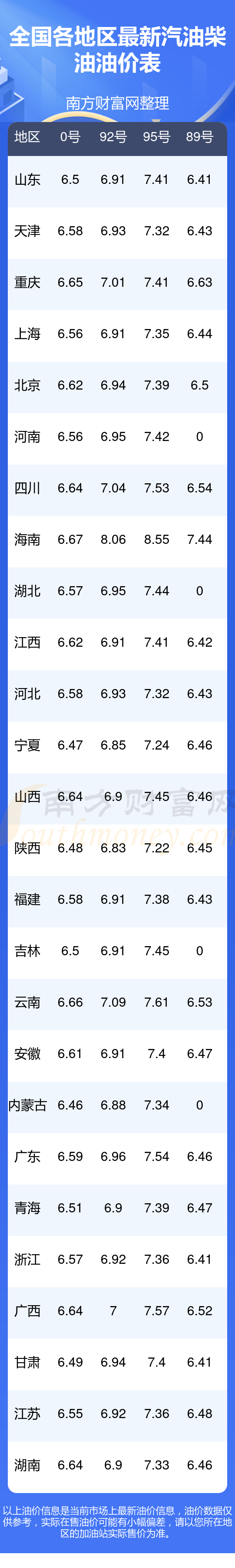 以上油價信息是當(dāng)前市場上最新油價信息,油價數(shù)據(jù)僅供參考,實際在售油價可能有小幅偏差,請以您所在地區(qū)的加油站實際售價為準(zhǔn)。