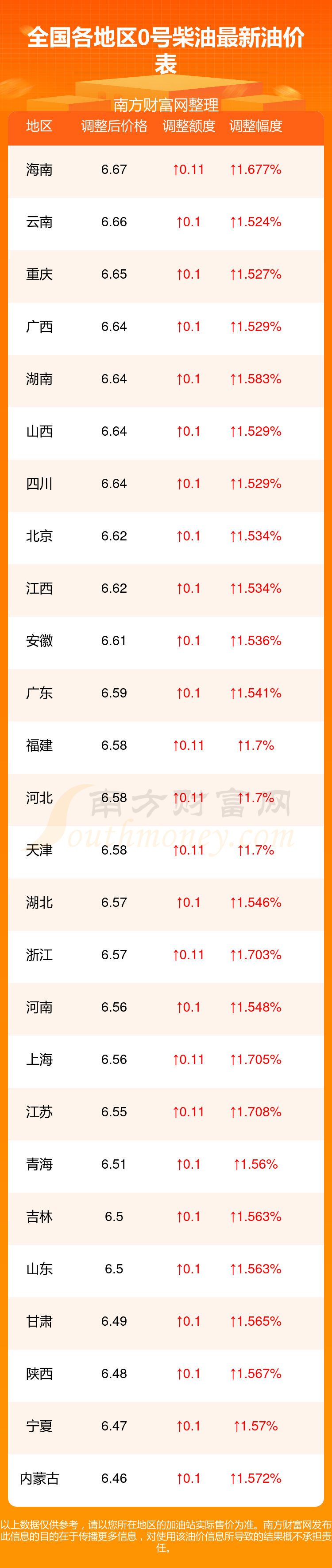 全國各地區(qū)最新0號柴油油價表