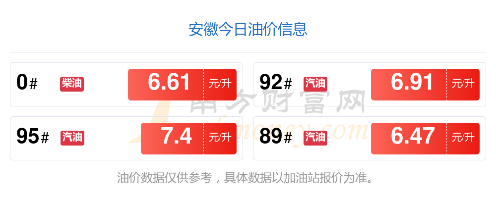 11月16日,安徽汽油、柴油的價(jià)格為11月11日調(diào)整后的價(jià)格。具體為:92號(hào)汽油6.91元,上漲了0.1元;95號(hào)汽油7.4元,上漲了0.1元;89號(hào)汽油6.47元,上漲了0.1;0號(hào)柴油6.61元,上漲了0.1元。