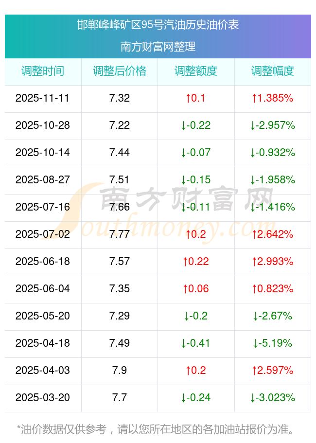 邯鄲峰峰礦區(qū)11月16日95號汽油歷史油價調(diào)整一覽表