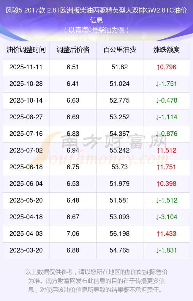 按照11月11日0號(hào)柴油最新調(diào)整價(jià)格6.51元/升來計(jì)算(以青海為例),該車型百公里平均油費(fèi)為51.82元,按照上一輪10月28日調(diào)整價(jià)格6.41元/升來計(jì)算,百公里平均油費(fèi)為51.024元,對(duì)比上一輪多花0.796元,下一輪油價(jià)調(diào)整時(shí)間為11月24日24時(shí)。