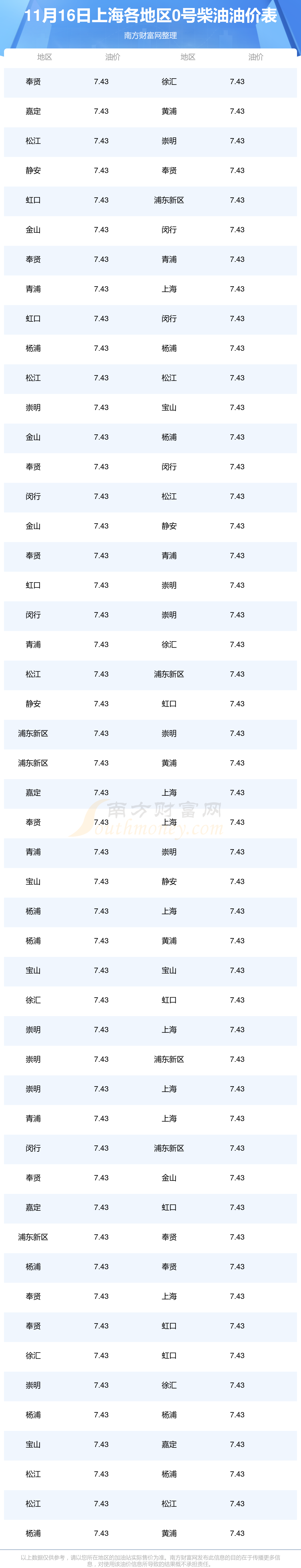 2025年11月16日上海0號柴油最新價格一覽表