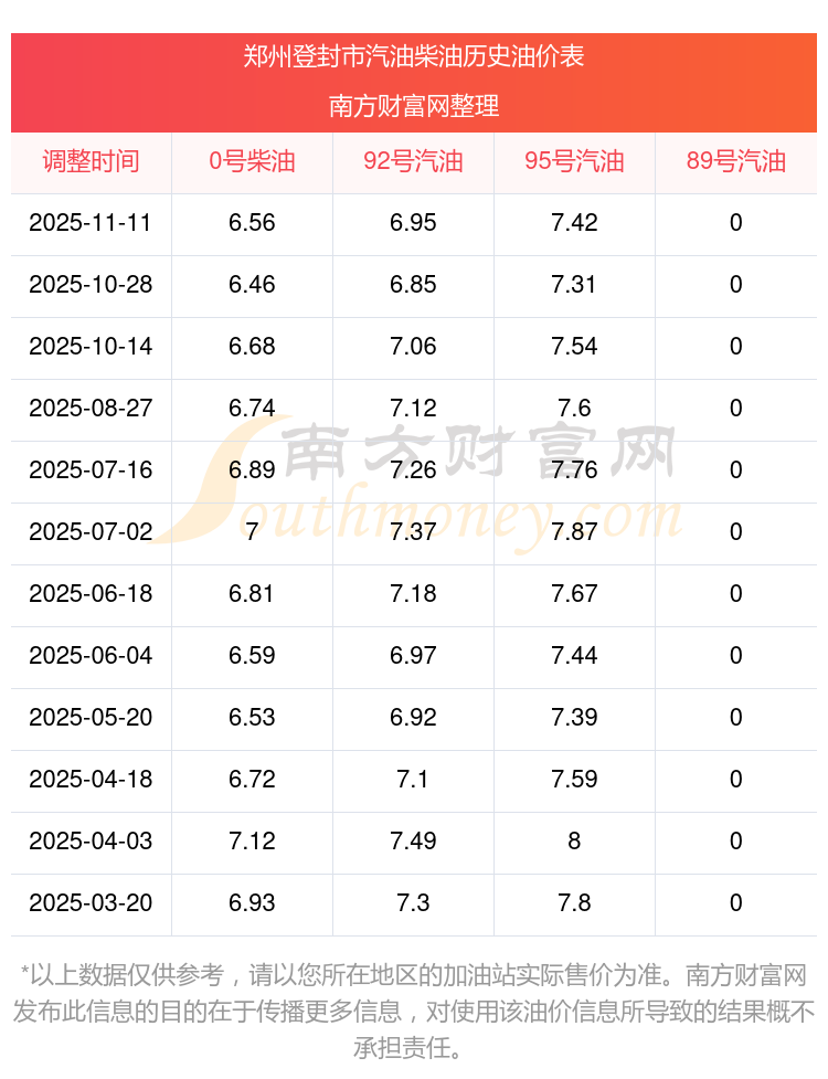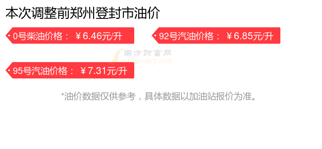 鄭州登封市汽油、柴油11月16日每升的價(jià)格(油價(jià)調(diào)整時間11月11日):92號汽油6.95元;95號汽油7.42元;0號柴油6.56元。