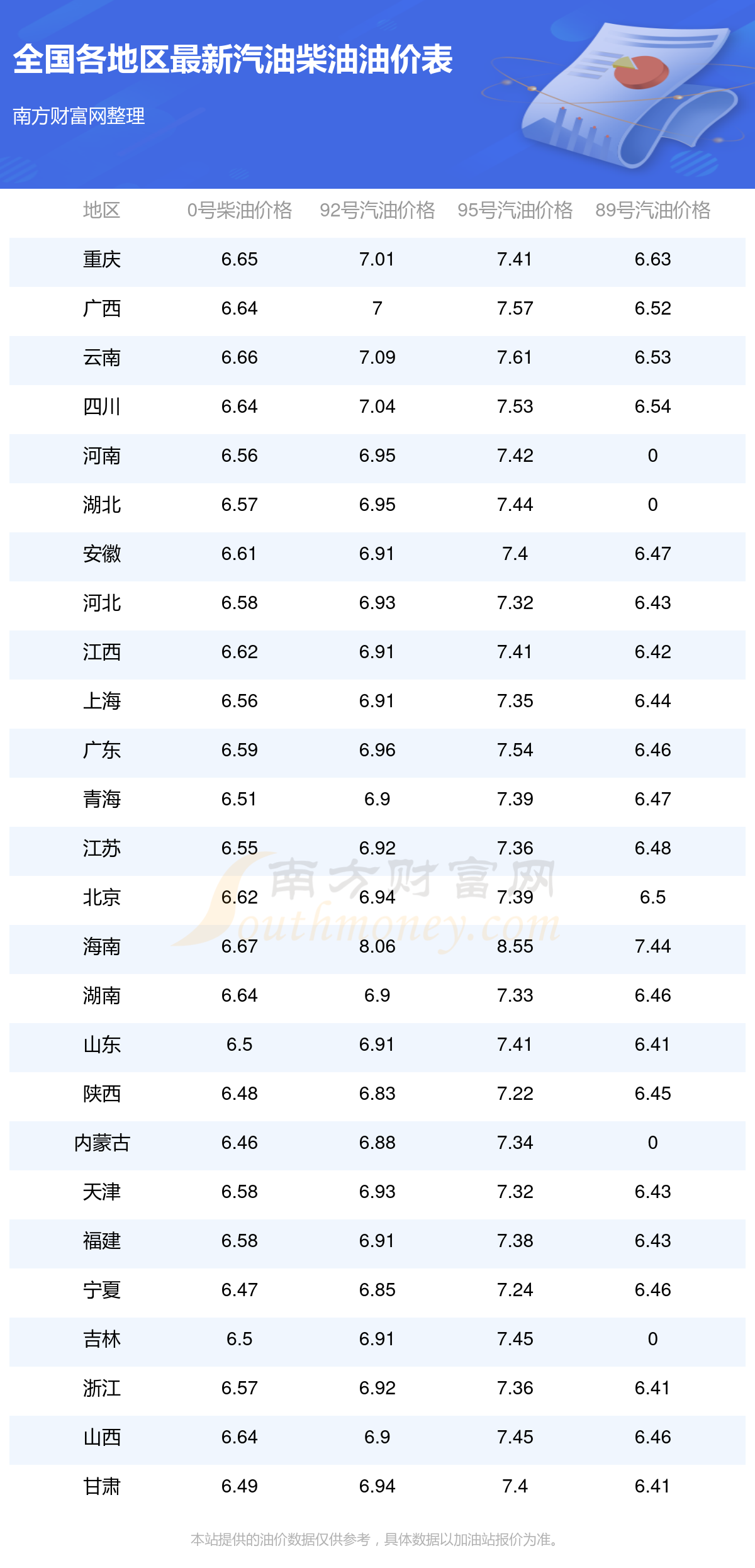 以上油價(jià)信息是當(dāng)前市場(chǎng)上最新油價(jià)信息,油價(jià)數(shù)據(jù)僅供參考,實(shí)際在售油價(jià)可能有小幅偏差,請(qǐng)以您所在地區(qū)的加油站實(shí)際售價(jià)為準(zhǔn)。