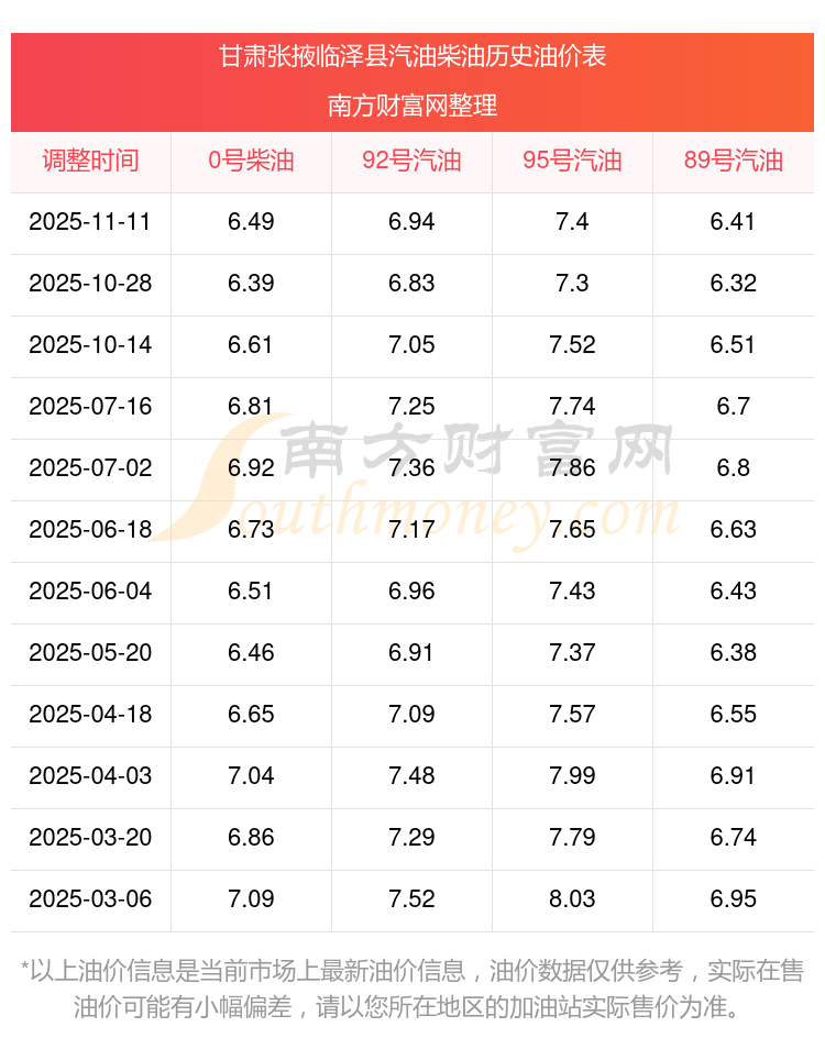 甘肅張掖臨澤縣歷史油價表
