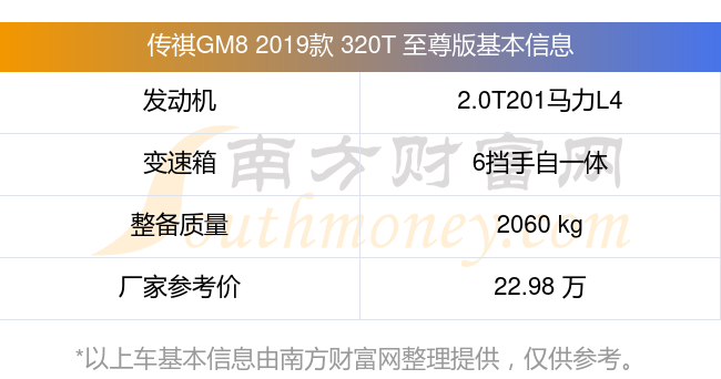 傳祺GM8 2019款 320T 至尊版搭載了一臺2.0T201馬力L4渦輪增壓發(fā)動機,采用6擋手自一體自動檔變速箱,常規(guī)整備質(zhì)量2060kg,廠家參考價22.98萬元。