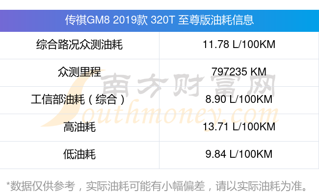 根據(jù)車主實測數(shù)據(jù),該車型低油耗為9.84升/百公里,高油耗為13.71升/百公里,綜合路況眾測油耗為11.78升/百公里,工信部綜合油耗為8.90升/百公里。