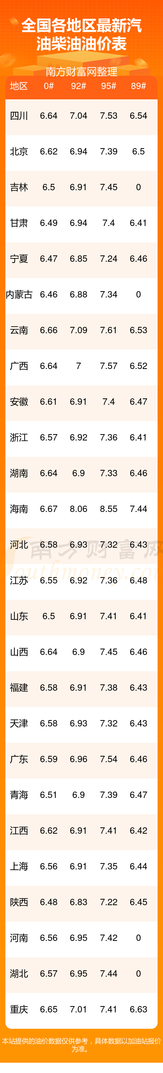 以上油價(jià)信息是當(dāng)前市場(chǎng)上最新油價(jià)信息,油價(jià)數(shù)據(jù)僅供參考,實(shí)際在售油價(jià)可能有小幅偏差,請(qǐng)以您所在地區(qū)的加油站實(shí)際售價(jià)為準(zhǔn)。