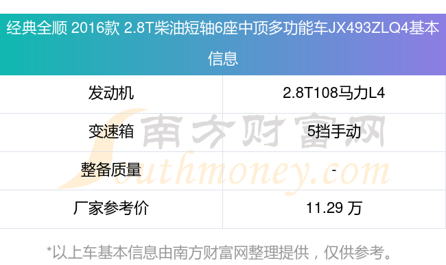 在動力上,經(jīng)典全順 2016款 2.8T柴油短軸6座中頂多功能車JX493ZLQ4配備的是一臺2.8T108馬力L4渦輪增壓發(fā)動機,匹配的是5擋手動擋變速箱,燃料形式為柴油,廠家參考價11.29萬元。