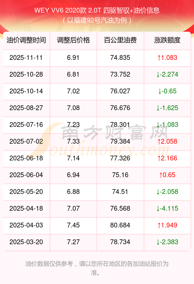 根據(jù)11月11日92號汽油最新調(diào)整價格6.91元/升來計(jì)算(以福建為例),該車型每百公里的平均油費(fèi)是74.835元,上一輪10月28日調(diào)整價格6.81元每升來計(jì)算,每百公里的平均油費(fèi)是73.752元,對比上一輪多花1.083元,下一輪的油價調(diào)整時間是11月24日24時。