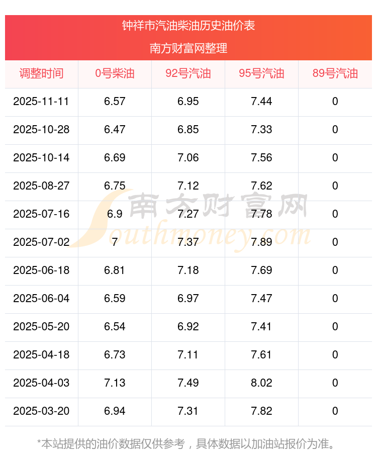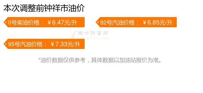 鐘祥市汽油柴油11月16日的價格每升多少錢?具體為:92號汽油為6.95元,漲了0.1元;95號汽油為7.44元,漲了0.11元;0號柴油為6.57元,漲了0.1元,本輪油價的調(diào)整時間為11月11日。