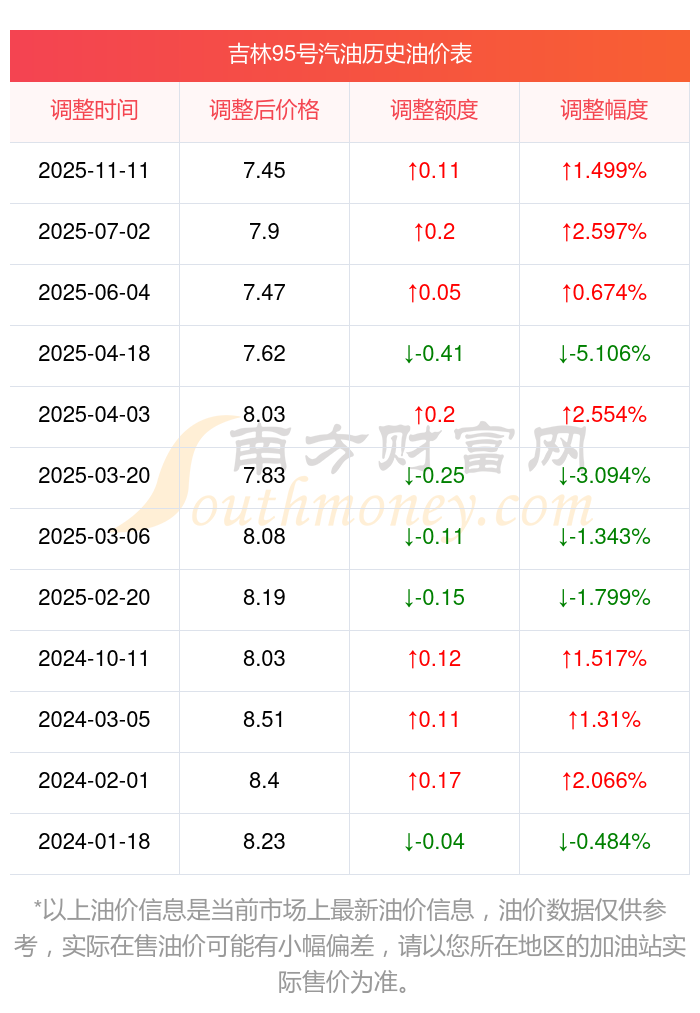 吉林95號(hào)汽油11月16日的最新價(jià)格是7.45元每升,這輪調(diào)整時(shí)間是11月11日,相對(duì)上次油價(jià)調(diào)整上調(diào)了0.11元。