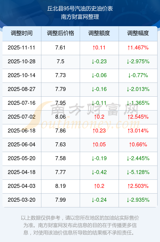 丘北縣95號汽油歷史油價(jià)表