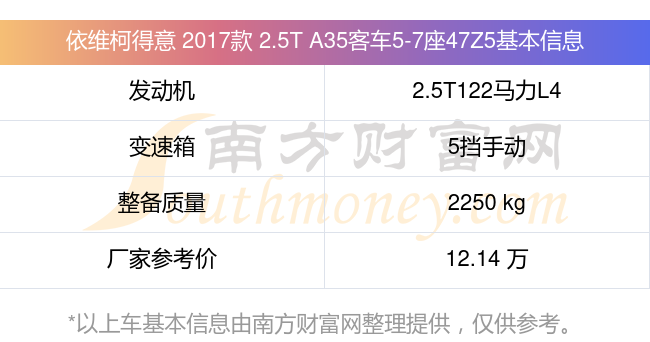 依維柯得意 2017款 2.5T A35客車5-7座47Z5搭載了一臺(tái)2.5T122馬力L4渦輪增壓發(fā)動(dòng)機(jī),采用5擋手動(dòng)擋變速箱,常規(guī)整備質(zhì)量2250kg,廠家參考價(jià)12.14萬(wàn)元。