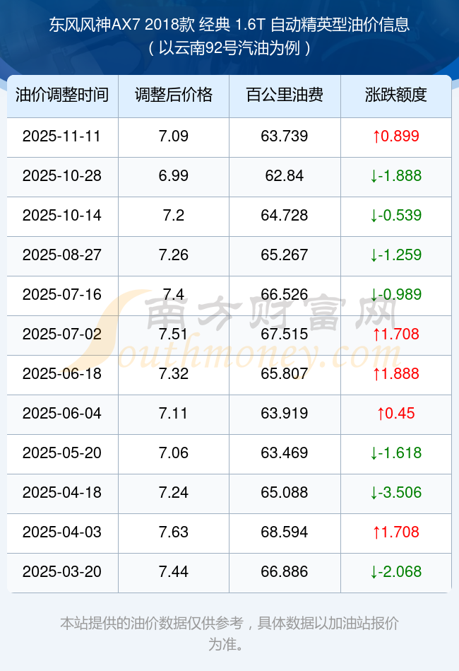 按照11月11日92號(hào)汽油最新調(diào)整價(jià)格7.09元/升來(lái)計(jì)算(以云南為例),該車型百公里平均油費(fèi)為63.739元,按照上一輪10月28日調(diào)整價(jià)格6.99元/升來(lái)計(jì)算,百公里平均油費(fèi)為62.84元,對(duì)比上一輪多花0.899元,下一輪油價(jià)調(diào)整時(shí)間為11月24日24時(shí)。