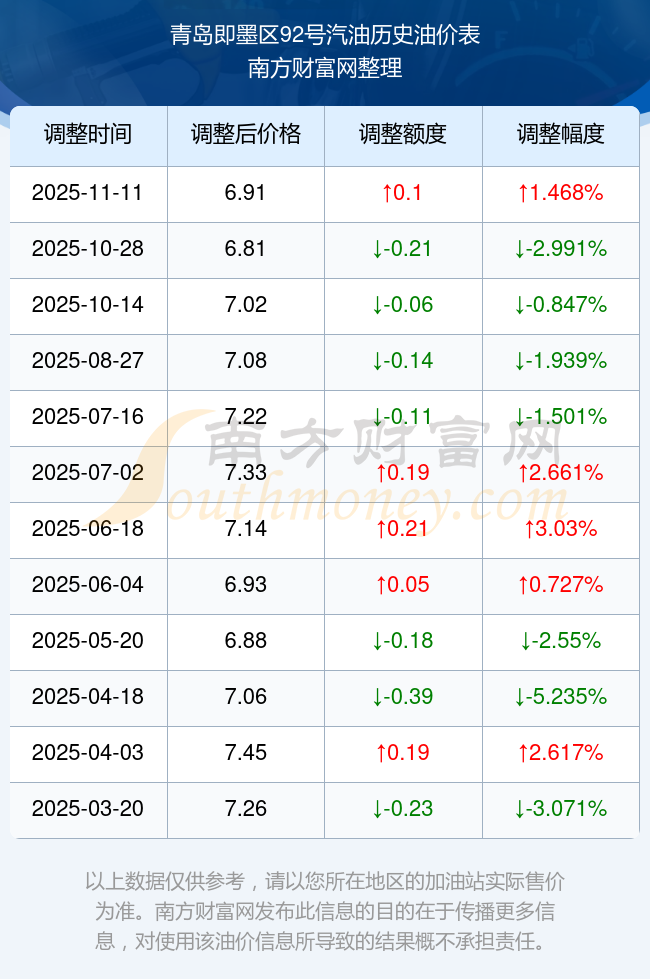 11月16日青島即墨區(qū)92號(hào)汽油歷史油價(jià)調(diào)整一覽表