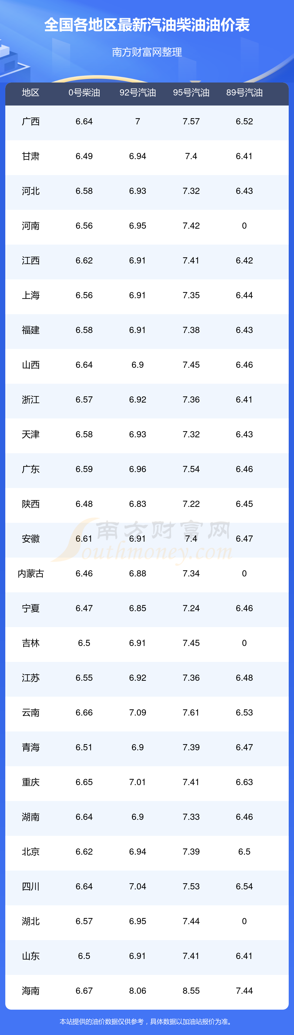 以上油價信息是當前市場上最新油價信息,油價數(shù)據(jù)僅供參考,實際在售油價可能有小幅偏差,請以您所在地區(qū)的加油站實際售價為準。