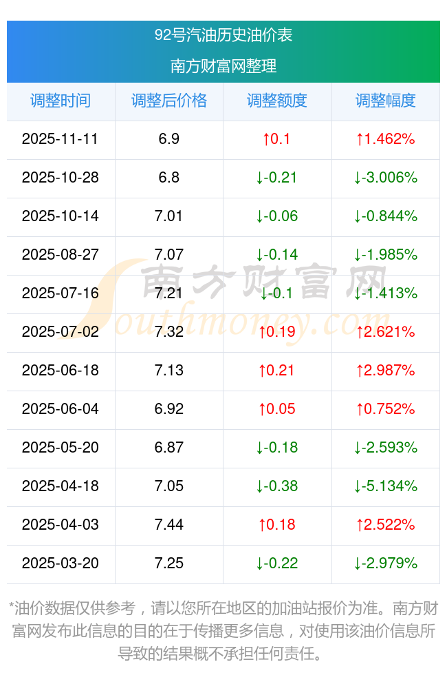 11月16日,汽油、柴油每升最新價(jià)格為(11月11日調(diào)整后的價(jià)格):92號(hào)汽油為6.9元,上漲了0.1元,上漲幅達(dá)1.46%;95號(hào)汽油為7.33元,上漲了0.11元,上漲幅達(dá)1.46%;89號(hào)汽油為6.46元,上漲了0.09元,上漲幅達(dá)1.46%;0號(hào)柴油為6.64元,上漲了0.1元,上漲幅達(dá)1.58%。下一輪油價(jià)調(diào)整時(shí)間11月24日24時(shí),距離現(xiàn)在還有8.3天。