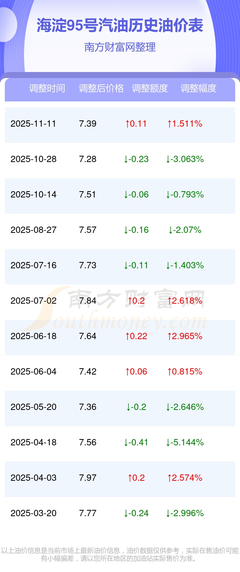 海淀95號汽油11月16日最新價格為7.39元/升,為11月11日油價調(diào)整后的價格,相對上次調(diào)整時間10月28日的油價7.28元每升,上升了0.11元,上升1.511%。