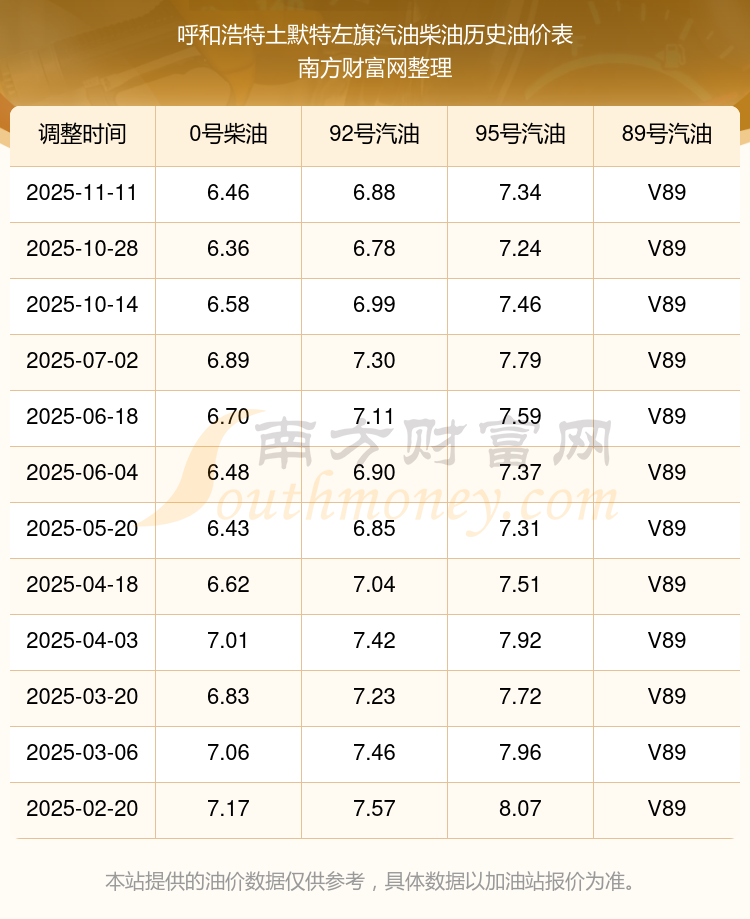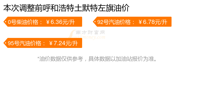 11月16日,呼和浩特土默特左旗汽油、柴油每升的價(jià)格是多少?本次油價(jià)調(diào)整時(shí)間是11月11日,92號(hào)汽油為6.88元,上調(diào)了0.1元,上調(diào)幅達(dá)1.48%;95號(hào)汽油為7.34元,上調(diào)了0.1元,上調(diào)幅達(dá)1.38%;0號(hào)柴油為6.46元,上調(diào)了0.1元,上調(diào)幅達(dá)1.57%。