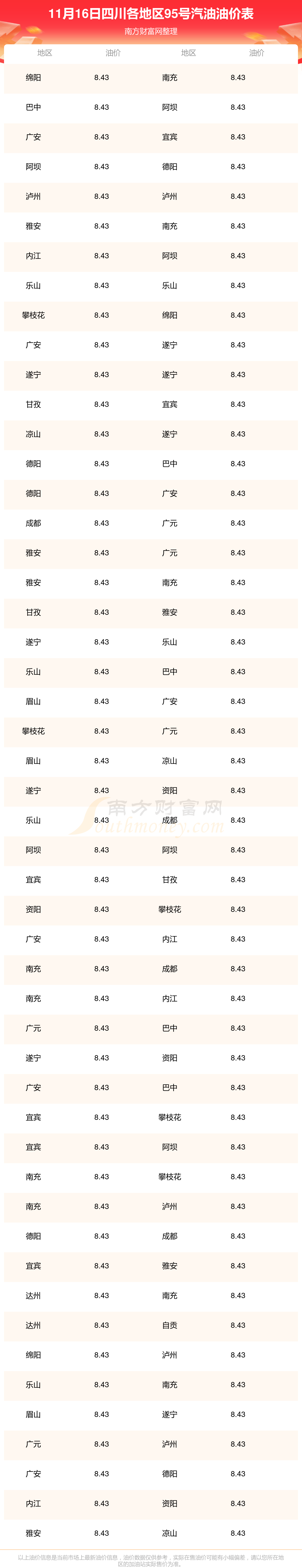 11月16日四川95號汽油的價格是11月11日調(diào)整后的價格,為7.53元每升,相對上一輪調(diào)整上調(diào)了0.11元,上調(diào)1.482%。