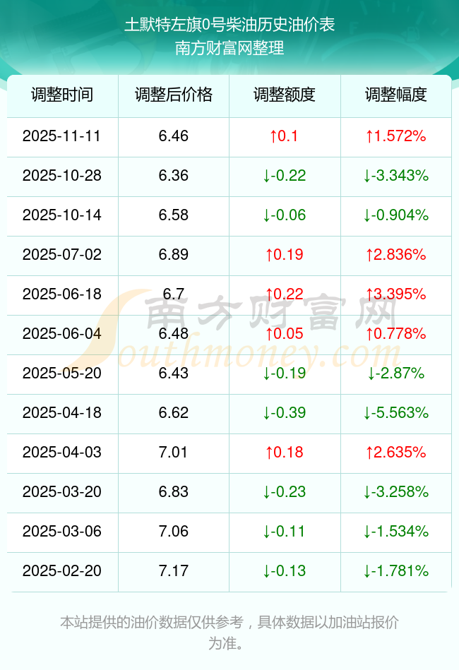 土默特左旗0號(hào)柴油歷史油價(jià)表
