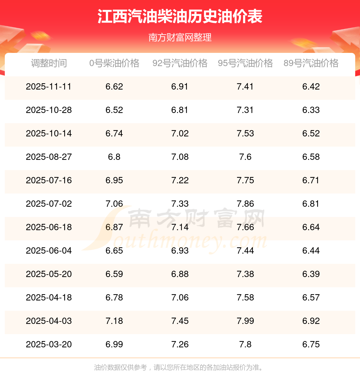 11月16日,江西汽油、柴油每升最新價格為:調整時間為11月11日,92號汽油為6.91元,上升了0.1元,上升幅達1.47%;95號汽油為7.41元,上升了0.1元,上升幅達1.37%;89號汽油為6.42元,上升了0.09元,上升幅達1.42%;0號柴油為6.62元,上升了0.1元,上升幅達1.53%。