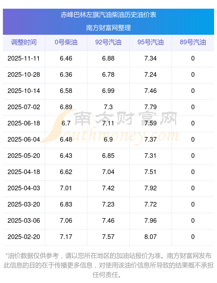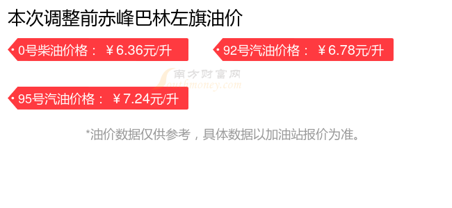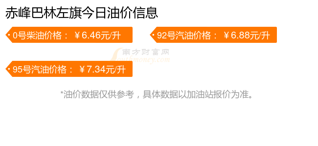 11月16日,赤峰巴林左旗汽油、柴油每升的價(jià)格為11月11日調(diào)整后的價(jià)格,具體為:92號(hào)汽油為6.88元,上調(diào)了0.1元,上調(diào)幅達(dá)1.48%;95號(hào)汽油為7.34元,上調(diào)了0.1元,上調(diào)幅達(dá)1.38%;0號(hào)柴油為6.46元,上調(diào)了0.1元,上調(diào)幅達(dá)1.57%。