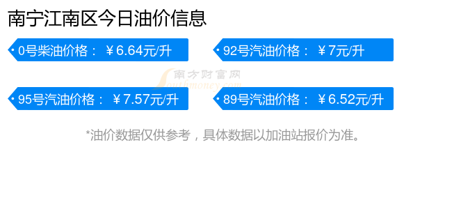 11月16日,南寧江南區(qū)汽油、柴油每升最新價格為:92號汽油為7元,上調(diào)了0.1元;95號汽油為7.57元,上調(diào)了0.11元;89號汽油為6.52元,上調(diào)了0.09元;0號柴油為6.64元,上調(diào)了0.1元,調(diào)整時間為11月11日。