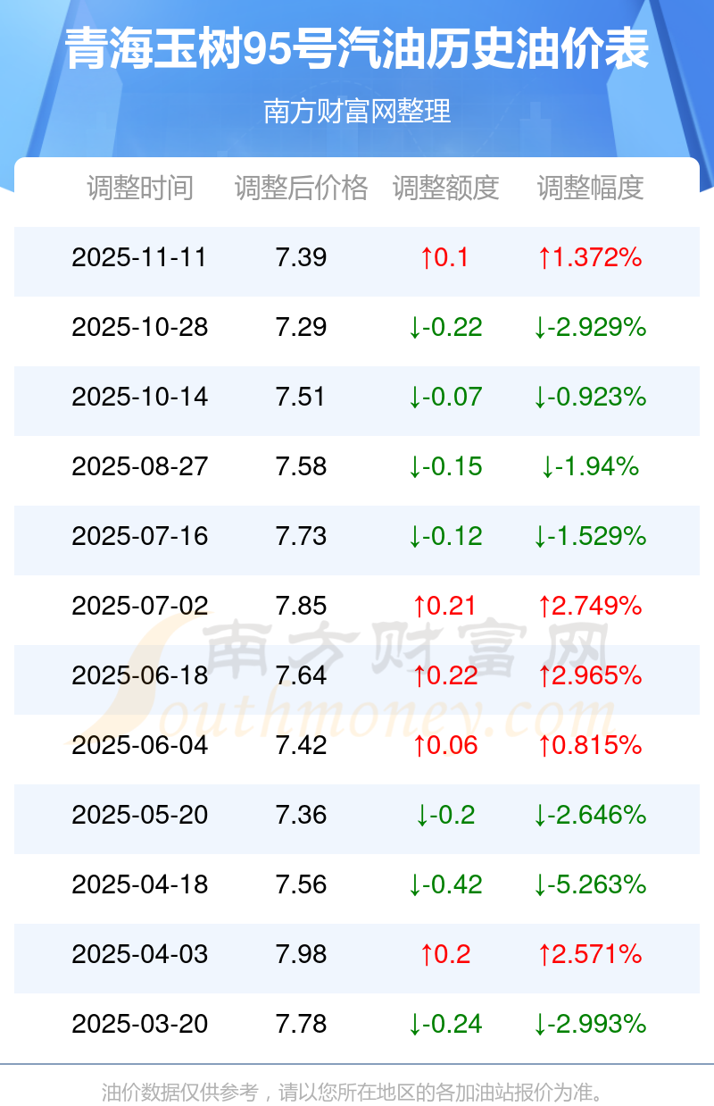 青海玉樹95號汽油11月16日的價格為每升7.39元,本次油價的調(diào)整時間11月11日,對比上次油價調(diào)整時間10月28日的價格7.29元/升,共上漲了0.1元,上漲幅達(dá)1.372%。下一輪油價調(diào)整時間11月24日24時,距離現(xiàn)在還有8.25天。