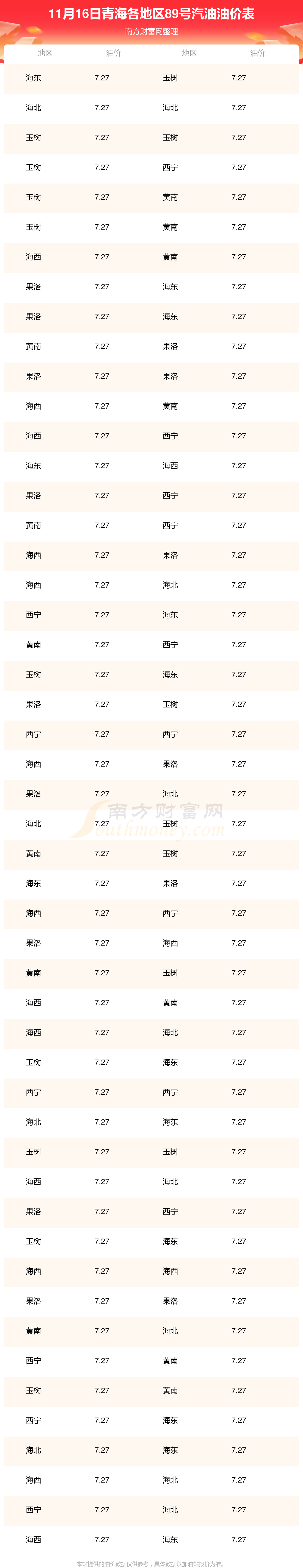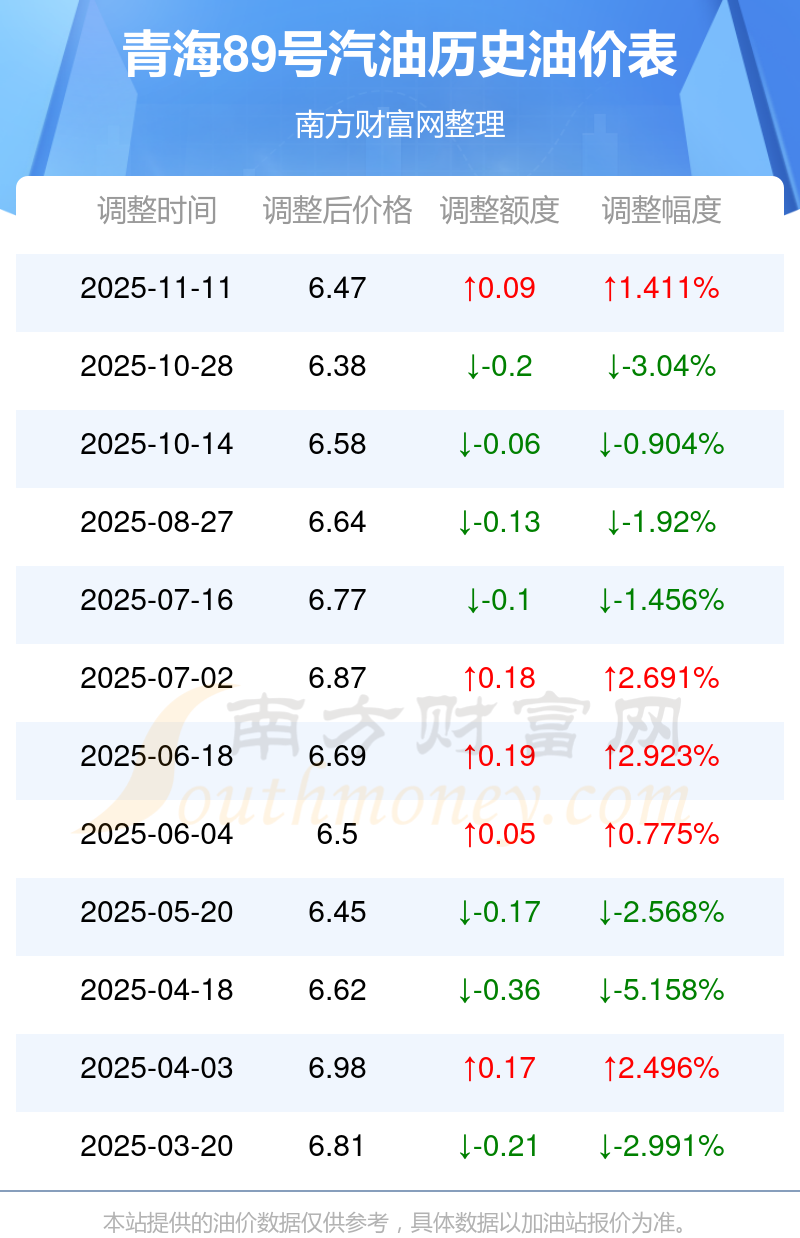 11月16日,青海89號汽油油價是6.47元每升,本次油價格調(diào)整時間為11月11日,上次調(diào)整時間為10月28日,青海89號汽油6.38元每升,本次對比上漲了0.09元。