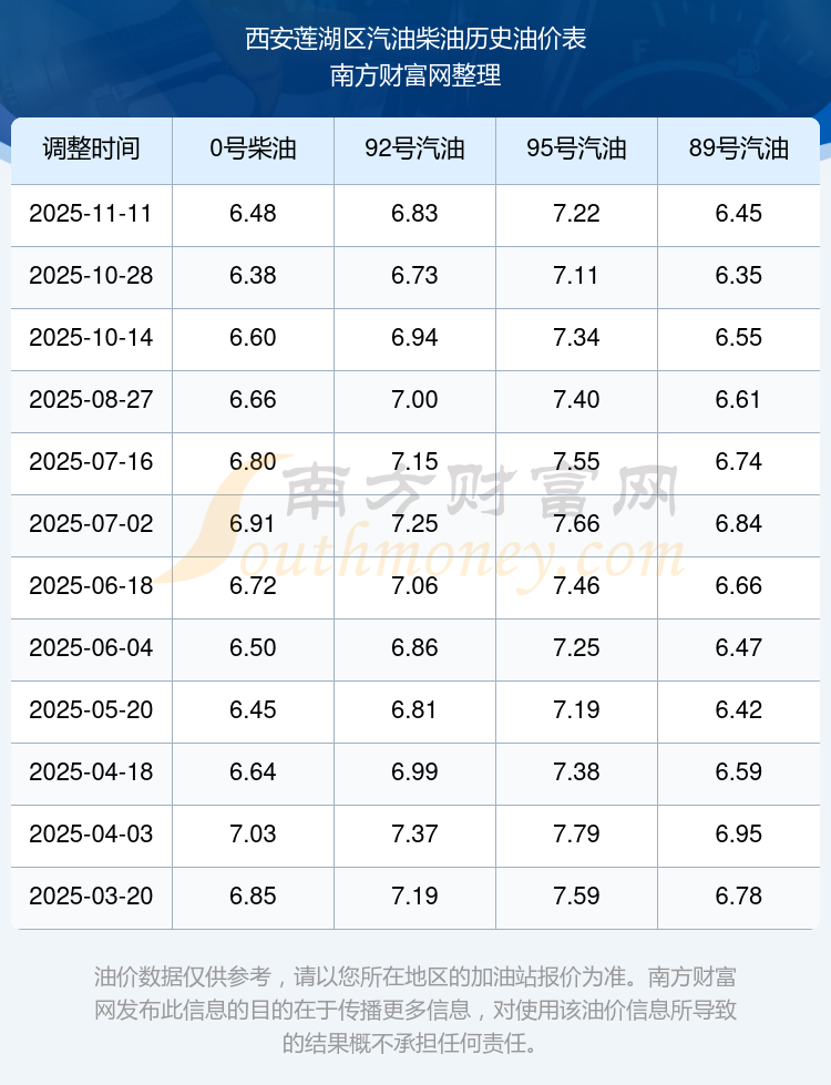 11月16日西安蓮湖區(qū)汽油、柴油每升的價(jià)格是11月11日調(diào)整后的價(jià)格:92號(hào)汽油為6.83元,漲了0.1元,漲幅達(dá)1.49%;95號(hào)汽油為7.22元,漲了0.11元,漲幅達(dá)1.55%;89號(hào)汽油為6.45元,漲了0.1元,漲幅達(dá)1.58%;0號(hào)柴油為6.48元,漲了0.1元,漲幅達(dá)1.57%。