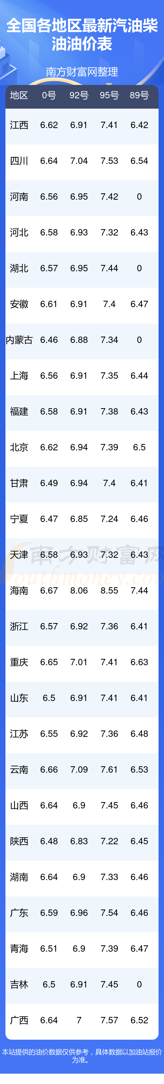 油價調(diào)整最新消息:11月16日的集美區(qū)汽油、柴油每升最新價格(調(diào)整時間為11月11日):92號汽油為6.91元,升了0.1元,升幅達(dá)1.47%;95號汽油為7.38元,升了0.11元,升幅達(dá)1.51%;89號汽油為6.43元,升了0.09元,升幅達(dá)1.42%;0號柴油為6.58元,升了0.11元,升幅達(dá)1.7%。下一輪油價調(diào)整時間11月24日24時。
