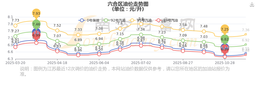 六合區(qū)11月16日95號汽油歷史油價調(diào)整走勢圖