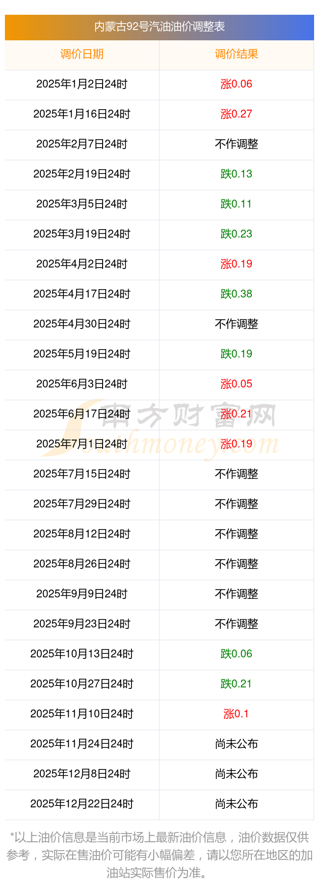 11月16日,呼和浩特汽油、柴油每升最新價格:本輪的油價調(diào)整時間是11月11日,92號汽油為6.88元,上升了0.1元,上升幅達1.48%;95號汽油為7.34元,上升了0.1元,上升幅達1.38%;0號柴油為6.46元,上升了0.1元,上升幅達1.57%。呼和浩特下一輪油價調(diào)整時間11月24日24時,距離現(xiàn)在還有8.24天。