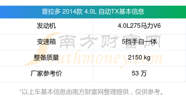 普拉多 2014款 4.0L 自動(dòng)TX搭載了一臺(tái)4.0L275馬力V6自然吸氣發(fā)動(dòng)機(jī),采用5擋手自一體自動(dòng)檔變速箱,常規(guī)整備質(zhì)量2150kg,廠家參考價(jià)53萬元。