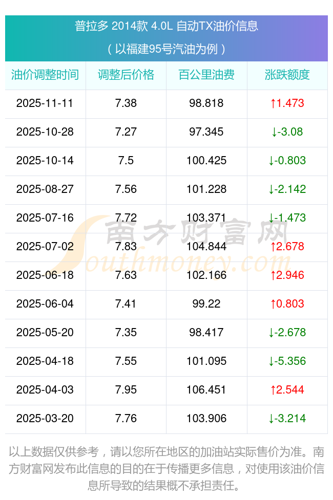 按照11月11日95號(hào)汽油最新調(diào)整價(jià)格7.38元/升來計(jì)算(以福建為例),該車型百公里平均油費(fèi)為98.818元,按照上一輪10月28日調(diào)整價(jià)格7.27元/升來計(jì)算,百公里平均油費(fèi)為97.345元,對(duì)比上一輪多花1.473元,下一輪油價(jià)調(diào)整時(shí)間為11月24日24時(shí)。