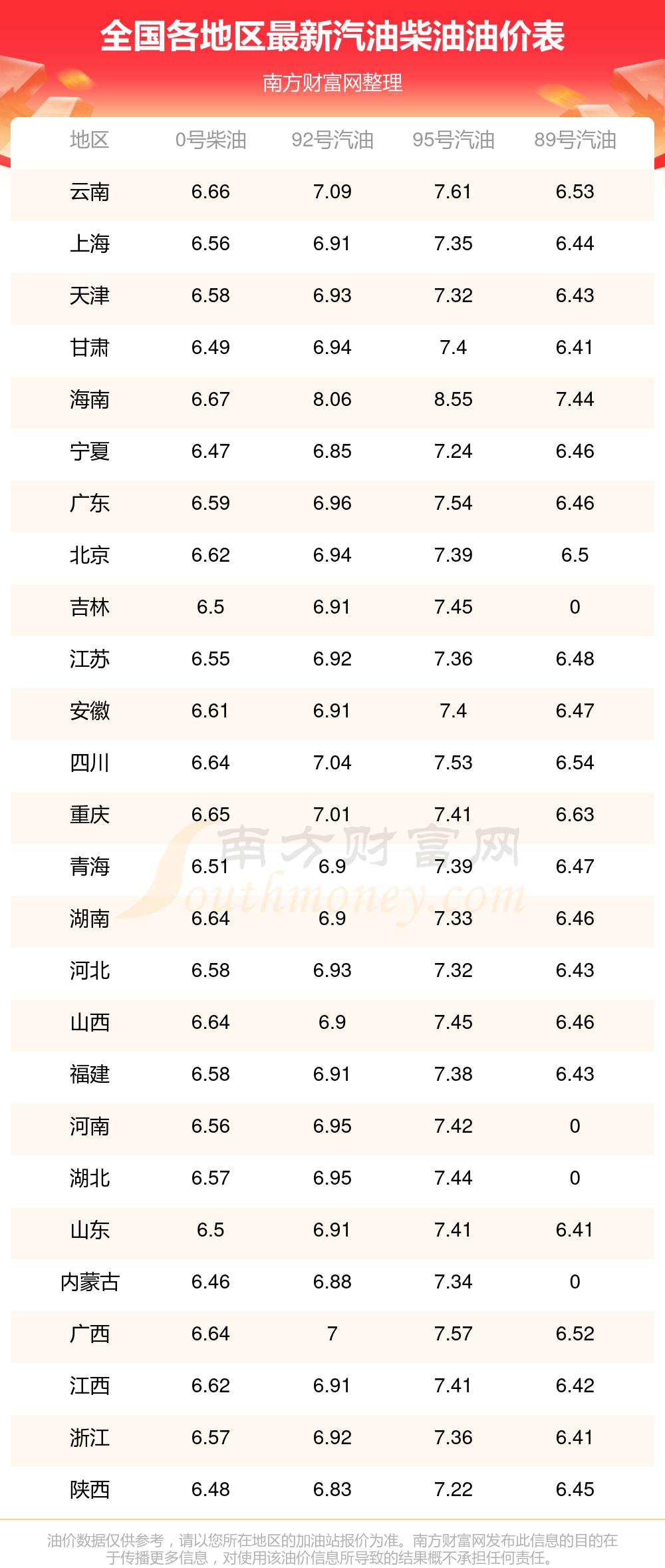11月16日全國92、95汽油最新價(jià)格表