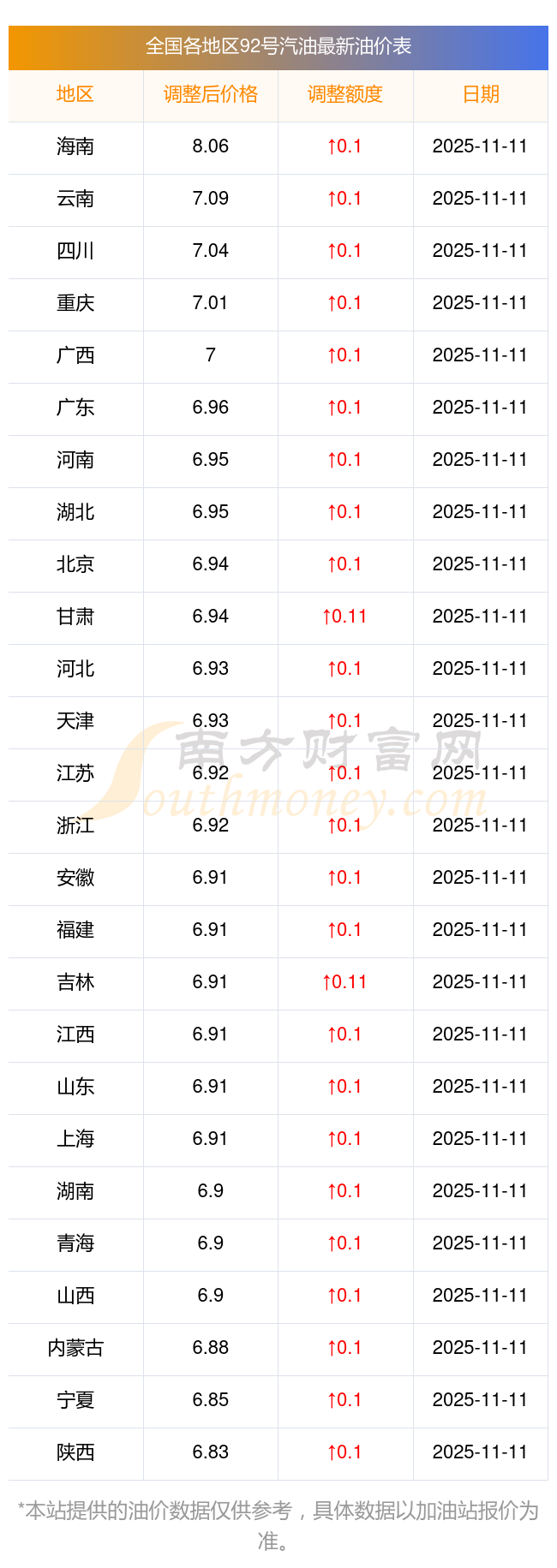 全國各地區(qū)92號汽油油價一覽表