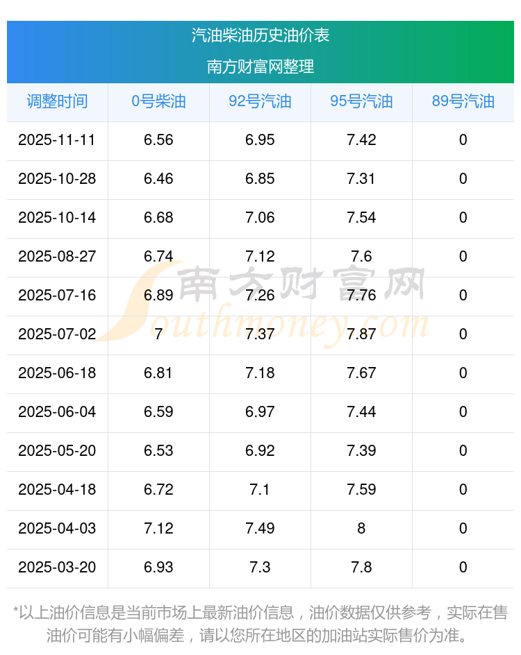 河南平頂山92號汽油11月16日價格(11月11日調整后的價格):6.95元每升,對比上次調整(10月28日)的價格6.85元每升增了0.1元,增幅達1.46%。下一輪油價調整時間11月24日24時,距離現(xiàn)在還有8.23天。