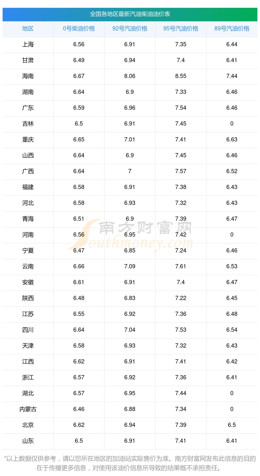 全國0號柴油平均價格為:7元每升,其中,最低為內蒙古,價格6.46元/升,最高為海南,價格6.67元/升。