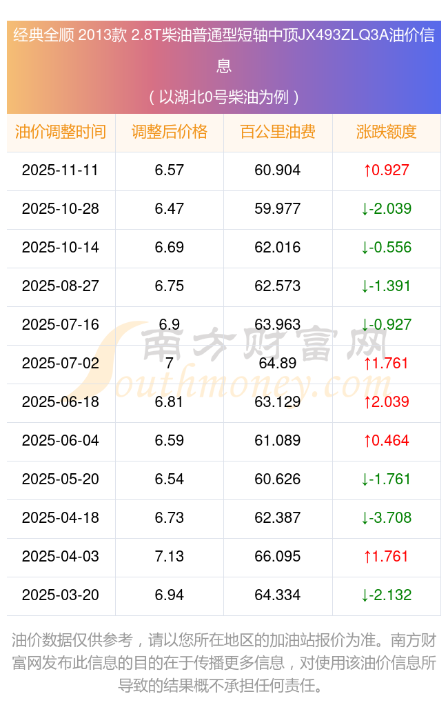 按照11月11日0號柴油最新調(diào)整價(jià)格6.57元/升來計(jì)算(以湖北為例),該車型百公里平均油費(fèi)為60.904元,按照上一輪10月28日調(diào)整價(jià)格6.47元/升來計(jì)算,百公里平均油費(fèi)為59.977元,對比上一輪多花0.927元,下一輪油價(jià)調(diào)整時(shí)間為11月24日24時(shí)。