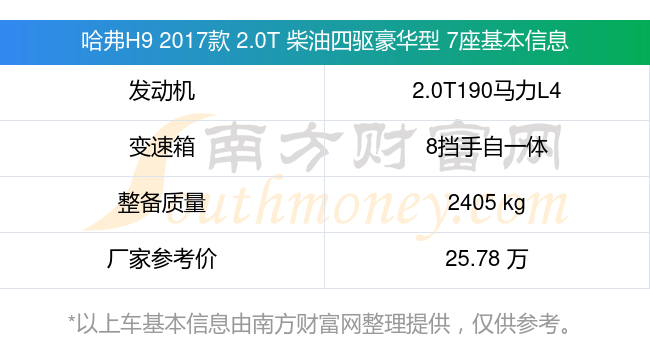 哈弗H9 2017款 2.0T 柴油四驅(qū)豪華型 7座搭載了一臺(tái)2.0T190馬力L4雙渦輪增壓發(fā)動(dòng)機(jī),采用8擋手自一體自動(dòng)檔變速箱,常規(guī)整備質(zhì)量2405kg,廠家參考價(jià)25.78萬(wàn)元。