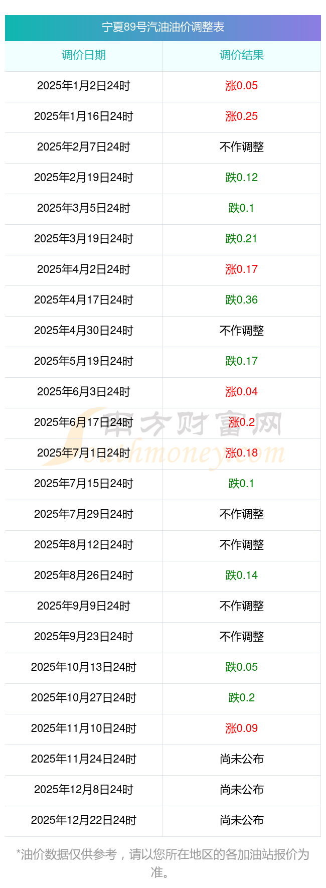 11月16日固原西吉縣89號(hào)汽油歷史油價(jià)調(diào)整一覽表