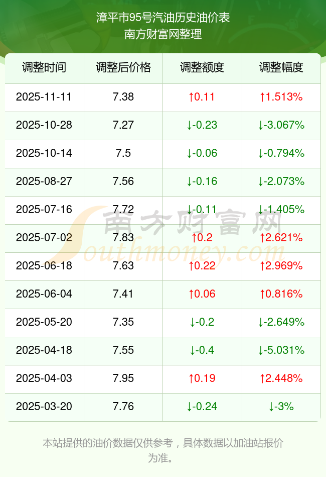 漳平市95號汽油11月16日最新價格為7.38元/升,調(diào)整時間為11月11日,相對上次調(diào)整時間10月28日的油價7.27元每升,上調(diào)了0.11元,上調(diào)1.513%。