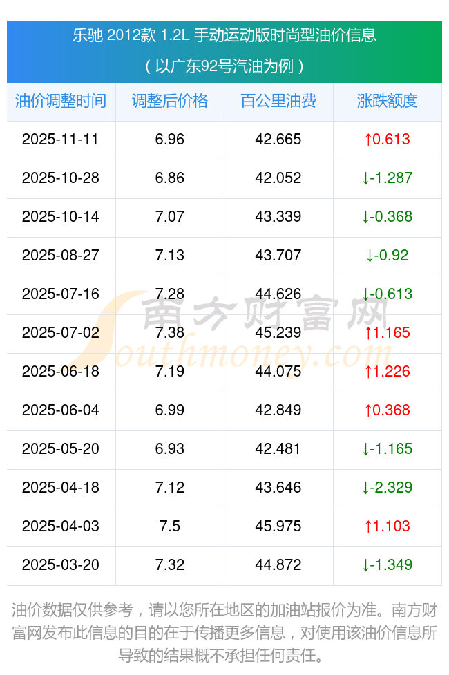 按照11月11日92號汽油最新調(diào)整價格6.96元/升來計算(以廣東為例),該車型百公里平均油費為42.665元,按照上一輪10月28日調(diào)整價格6.86元/升來計算,百公里平均油費為42.052元,對比上一輪多花0.613元,下一輪油價調(diào)整時間為11月24日24時。