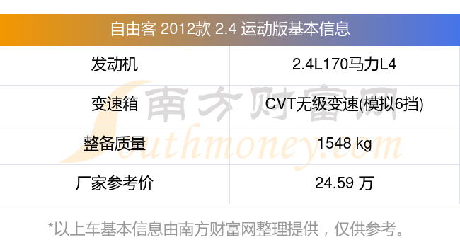 在動(dòng)力上,自由客 2012款 2.4 運(yùn)動(dòng)版配備的是一臺(tái)2.4L170馬力L4自然吸氣發(fā)動(dòng)機(jī),匹配的是CVT無(wú)級(jí)變速(模擬6擋)自動(dòng)檔變速箱,燃料形式為汽油,常規(guī)整備質(zhì)量1548kg,廠家參考價(jià)24.59萬(wàn)元。